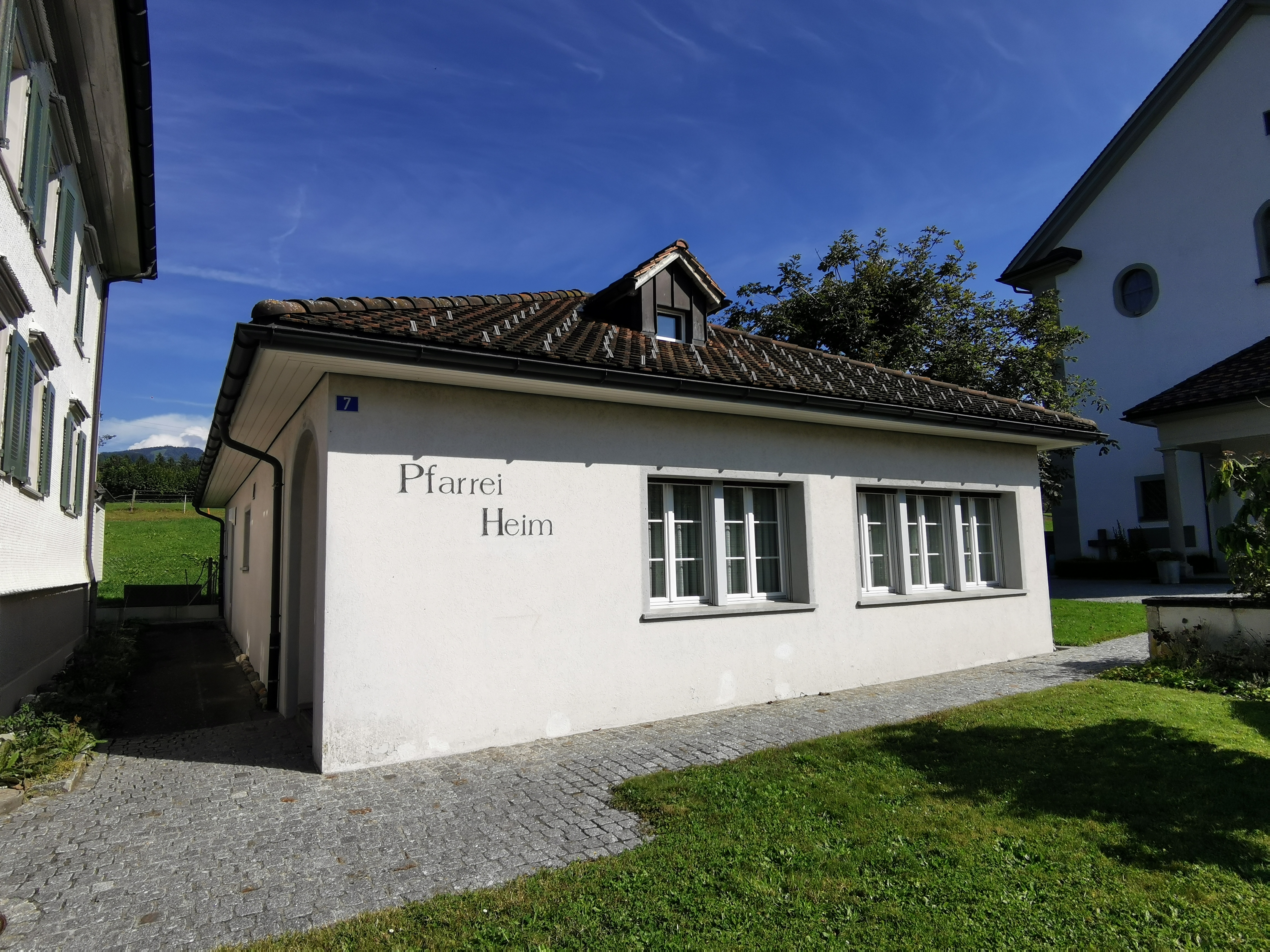 Das Pfarreiheim liegt direkt neben der Pfarrkirche.